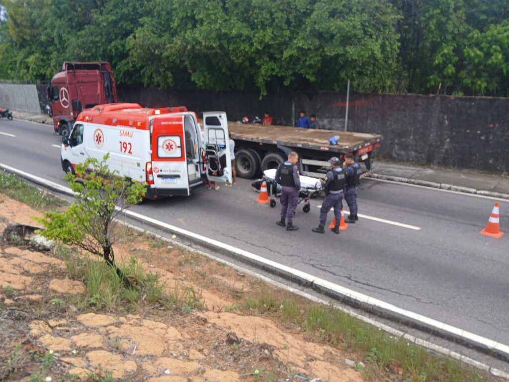 Dois homens ficaram gravemente feridos após um acidente envolvendo uma motocicleta e duas carretas, na manhã desta sexta-feira (31), na Avenida Rodrigo Otávio, sentido Centro,