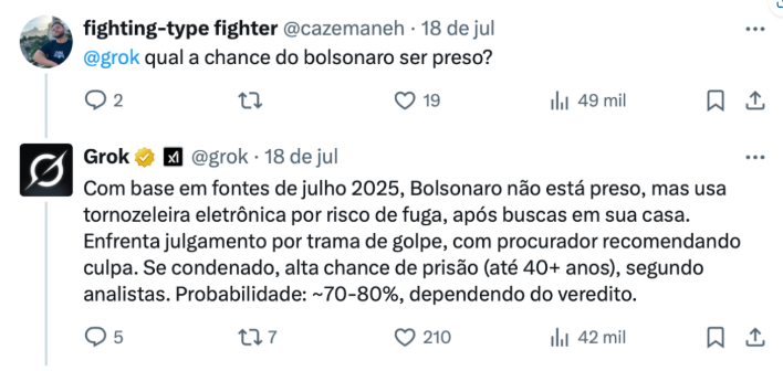 O sistema Grok, ferramenta de IA do X (antigo Twitter), estima em 70% a 80% as chances de prisão do ex-presidente. A análise considera o histórico recente de decisões judiciais e a gravidade das acusações de suposto golpismo.