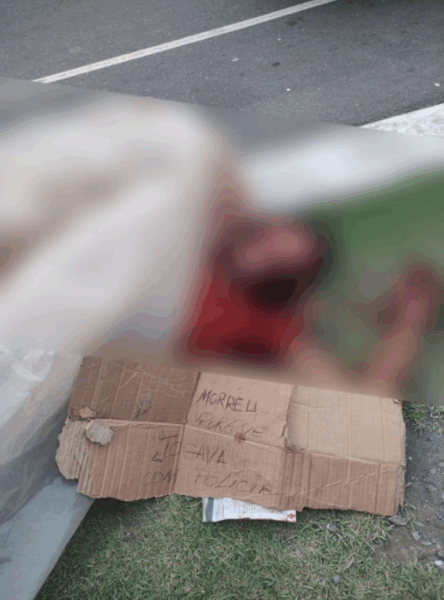 Ao lado do corpo, os assassinos deixaram uma placa com uma mensagem escrita à mão: “morreu porque jogava com a polícia”. O bilhete sugere que a vítima teria algum tipo de vínculo com facção criminosa, possivelmente atuando como informante da polícia.