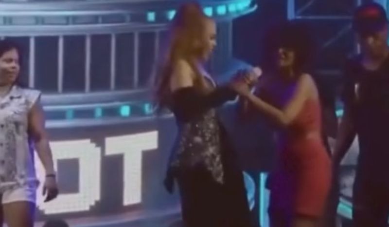 Joelma tentou fingir normalidade, mas não gostou nada da conduta de uma fã que subiu no palco do seu show, pegou o microfone de sua