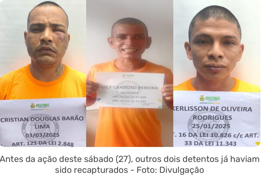 Três detentos que haviam fugido da Unidade Prisional de Maués (UPM), no interior do Amazonas, foram recapturados na manhã deste sábado (27) durante uma ação