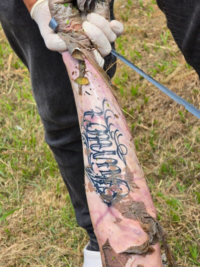 A perícia também localizou uma tatuagem no braço da vítima, escrito “Júnior”. O corpo foi encaminhado para o Instituto Médico Legal (IML), onde passará por exames de necropsia para confirmar a identidade da vítima e a causa da morte.