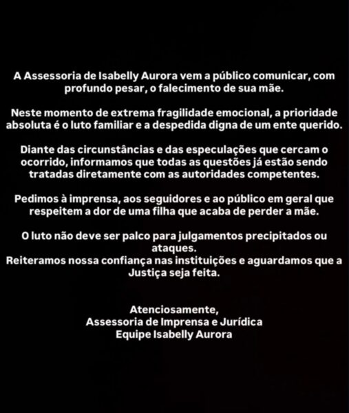 A equipe de Isabelly divulgou um comunicado oficial pedindo respeito ao momento de luto e ressaltando que todas as questões relacionadas ao crime estão sob responsabilidade das autoridades.