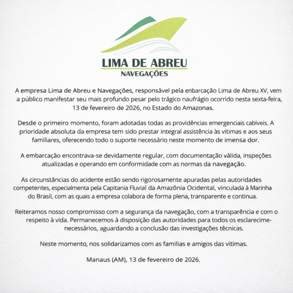 A empresa Lima de Abreu Navegações informou, em nota oficial, que a embarcação estava com documentação válida, inspeções atualizadas e operava conforme as normas da navegação. A companhia declarou que adotou providências emergenciais desde o primeiro momento e afirmou estar prestando assistência às vítimas e familiares, além de colaborar com as autoridades responsáveis pela investigação.